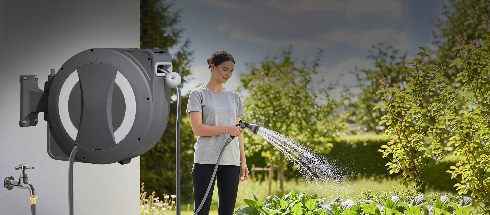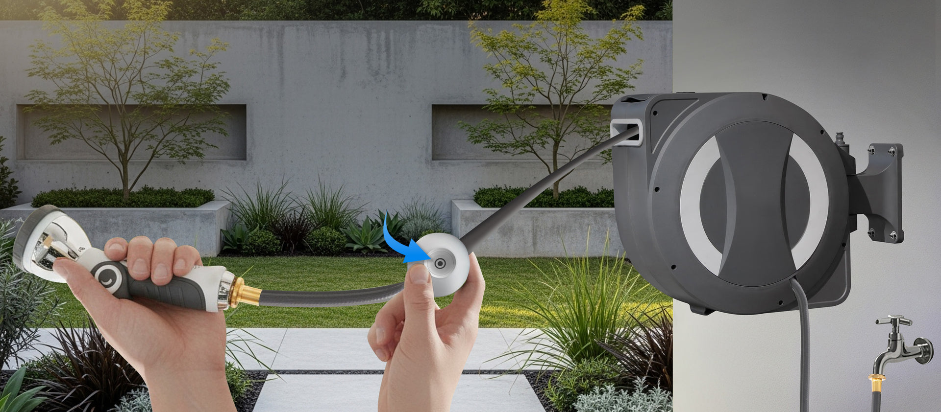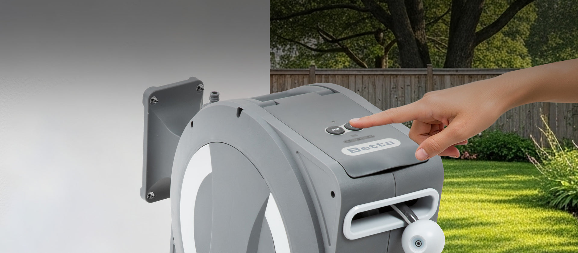 Make garden care effortless with the Betta EaseReel Wall-Mounted Retractable Hose Reel System, available in two models—EaseReel-100 with a 100FT (30m) hose and EaseReel-78 with a 78FT (23m) hose. This all-in-one solution comes with an 8-pattern adjustable spray nozzle and a rechargeable lithium-ion powered automatic roll-up system. With the added One-Touch Hose Control, you can easily manage the hose length—press once to activate automatic retraction and press again to stop at any point, giving you the exact length needed for every task. The hose retracts smoothly and evenly, guided by an integrated hose guide that prevents tangles and kinks. The 180° swivel wall mount ensures complete garden coverage while keeping your hose neatly stored. Constructed with UV- and weather-resistant materials, the EaseReel provides dependable, year-round performance for all your watering and cleaning needs.